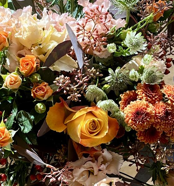 Burnt oranges and apricots with autumn berries and textural foliage. A beautiful seasonal gift or treat for home. The size shown is medium.