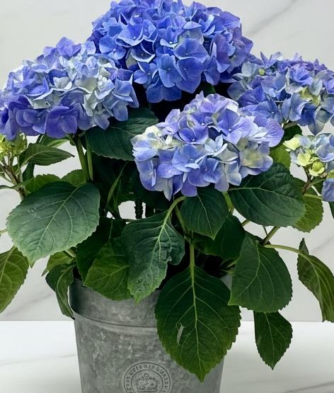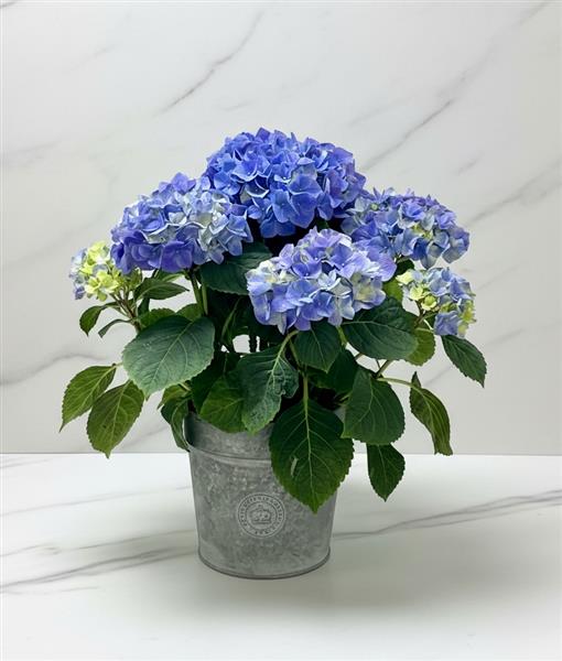 As stunning blue hydrangea with a brushed zinc pot, with a Royal Botanic Garden motif.