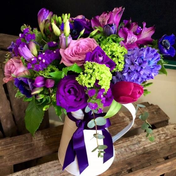 A 22cm. tall enamelled water jug filled with seasonal blue, purple and lime blooms
