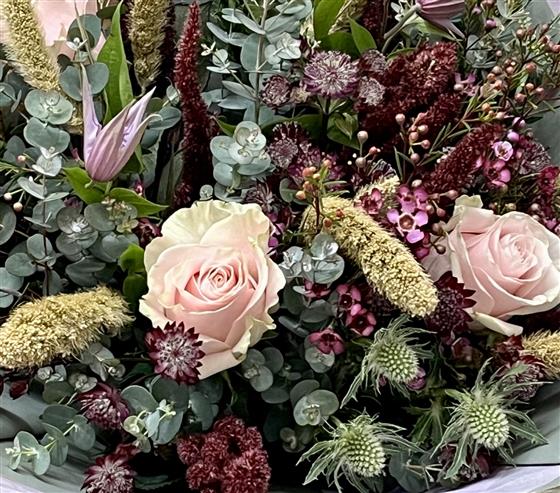 This boho-style hand-tied bouquet, is full of grasses and dried flowers combined with fresh blooms, to create a stylish addition to any room. It comes in water and a Martyn Crossley gift bag. The size shown is large.