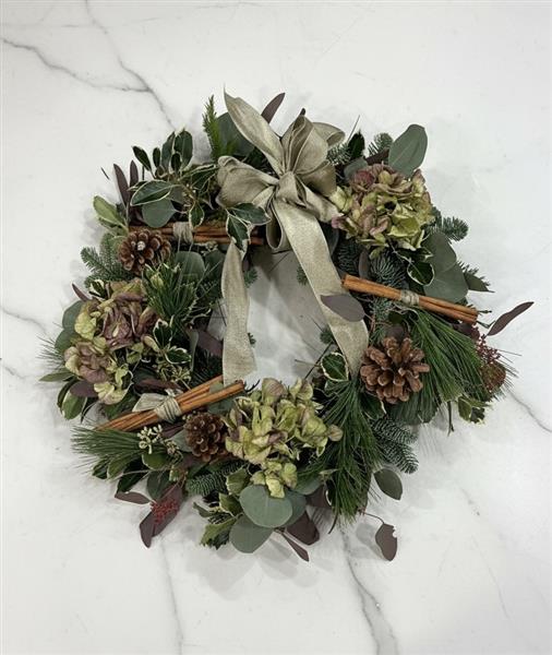 Featuring dried hydrangea, holly and cinnamon sticks, adorned with a silken ribbon. Hand-made in moss with mixed seasonal foliage and natural cones, this wreath shown is approximately 50cm wide (Standard)