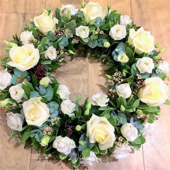 Classic Simplicity with creamy white flowers, including lush avalanche roses and mixed foliage