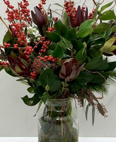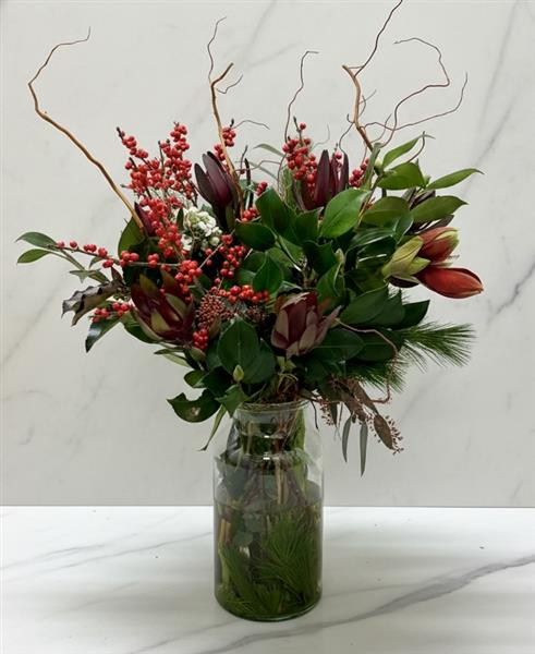 Tall, red blooms and berries, including ilex and amaryllis, arranged with seasonal foliage in a large recycled glass vase.