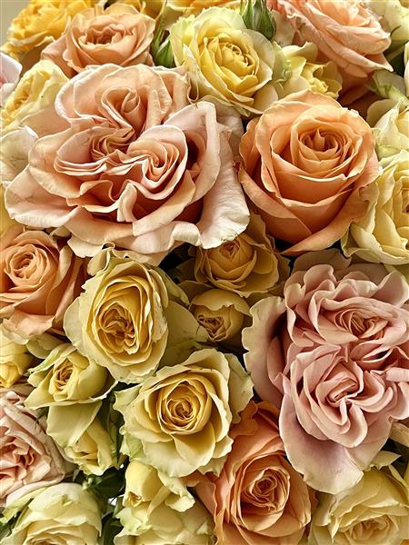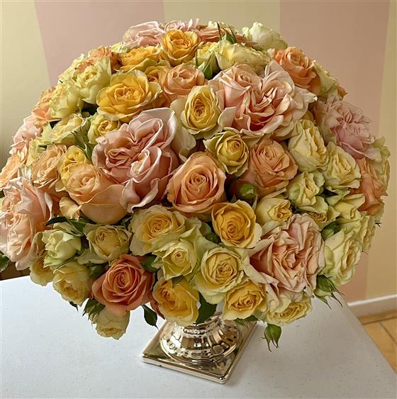 A stunning display of roses and spray roses in warm peaches, creams and golds. Arranged in floral foam in a glass, footed bowl. Approximate size is 40 cm high by 50 cm diameter.
