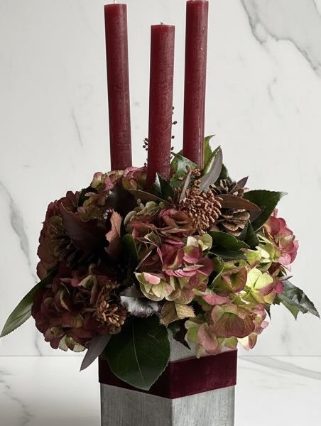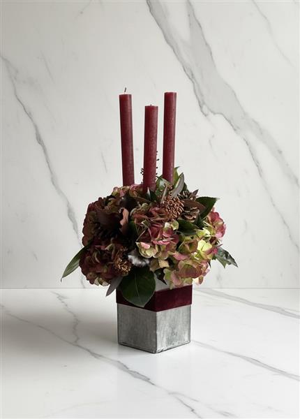 Red hydrangea, arranged with pinecones and three candles in an interesting hexagonal container, of powdered zinc. With a motif of 'Royal Botanical Garden Kew' this is a lovely container to use after Christmas. Dimension are approximately 45cm by 25cm
