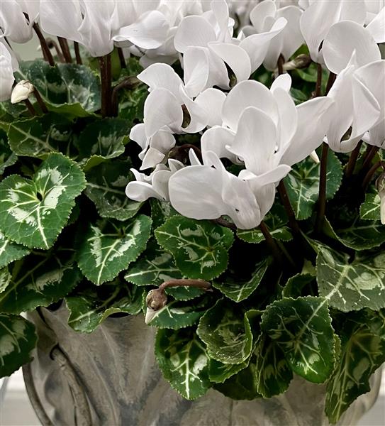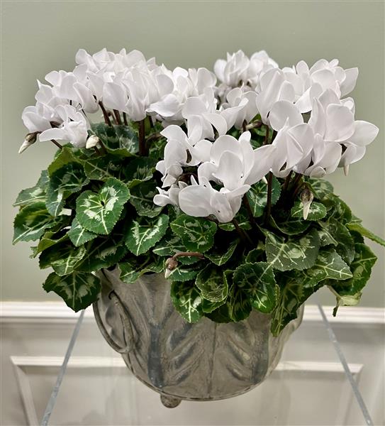 Mini cyclamen plants presented in a powdered zinc bowl with leaf detail. Plants can be removed for ease of watering and the whole gift is approximately 35cm in diameter and 30cm high. Item will be gift wrapped.