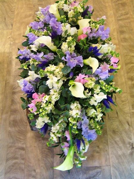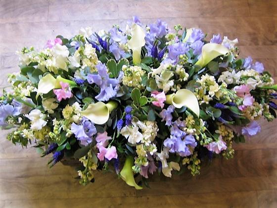 Delicate Lilac and Cream seasonal flowers and foliage form the basis of this pretty tribute.