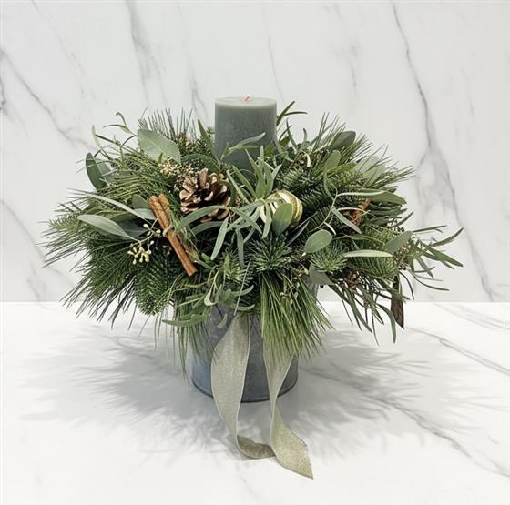 Natural foliages, including pine, eucalyptus and cypress, with cinnamon, natural cones and fruits. Arranged around a green or ivory pillar candle, in a powdered zinc plant container, with 'Royal Botanic Gardens Kew' motif. Perfect for using after Christmas. Arrangement stands approximately 30cm tall and 30cm wide (including candle).
