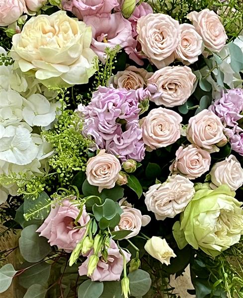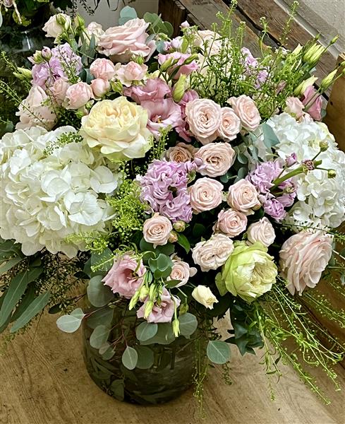 Palest pinks and creams, with scented stocks, hydrangea and other pastel blooms arranged in a recycled glass vase. An opulent gift for someone special.