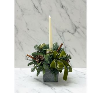 A petite arrangement in a powdered zinc square container, with Christmas foliage, cones, dried fruit slices and berries.