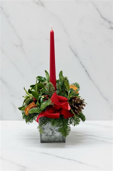 A petite arrangement in a powdered zinc square container, with Christmas foliage, cones, dried fruit slices and berries.