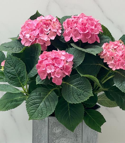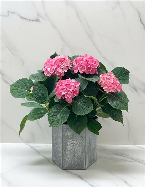 A lovely pink hydrangea plant in a hexagonal powdered zinc container, with a Royal Botanic Garden motif. The hydrangea can be enjoyed inside, then planted outside in a container or the garden if preferred. The approximate height of the gift is 40cm (container 17cm x 18cm) Please protect surfaces to avoid water damage.