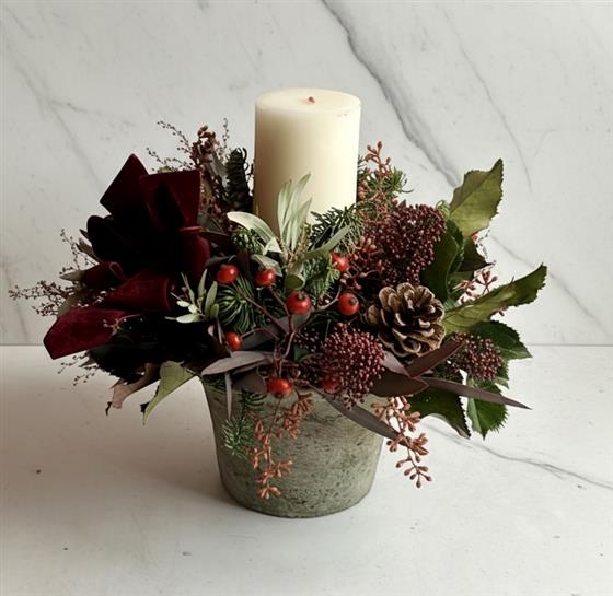 a rustic arrangement in with pine, rosehips and ruby foliage, surrounding an ivory church candle and accented with a ruby velvet ribbon. Arrangement measure approximately 30cm high and 30cm across.