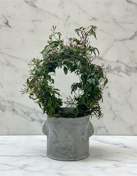 A pink jasmine plant will fill a room with scent. A firm favourite, this arrives in a powdered zinc container with a Royal Botanic Gardens motif and can be planted outside once the weather warms. Approximate size of gift is 35 cm tall (container 15cm x 15cm) Protecting surfaces is advised to avoid water damage.