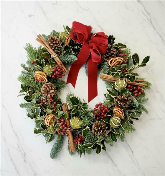 Bright fruits, with berries and cinnamon, hand-made in moss, trimmed with a red velvet bow. Wreath measures 40cm in diameter (standard)