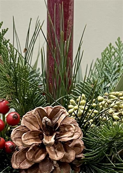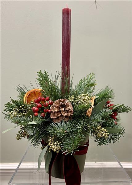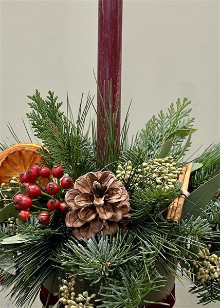 As the name suggests, a simple table arrangement, with a dinner candle, filled with scented Christmas foliage, cones, berries, cinnamon and dried fruits. Arranged in a dark green ceramic pot, the whole arrangement is approximately 42cm tall by 30cm across at its widest point.