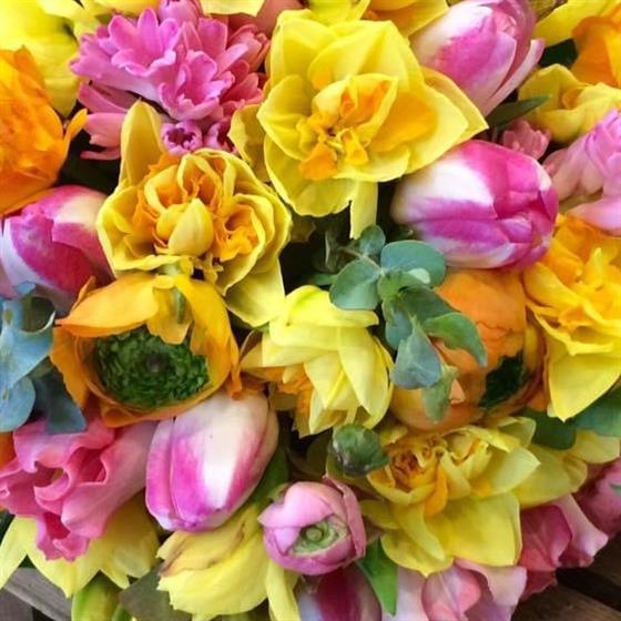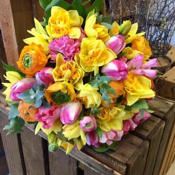 A tied short-stemmed posy of bright, sunny Spring flowers, including narcissus, tulips and ranunculus