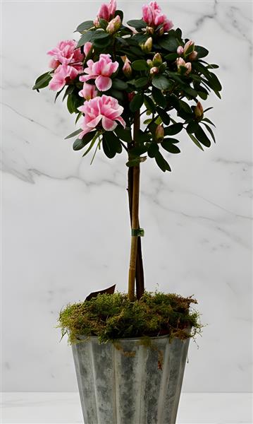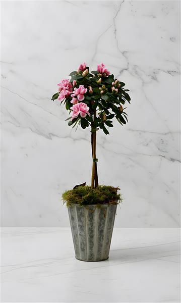 Standing 60cm tall, in an attractive fluted container of powdered zinc, this azalea is long-flowering and can be placed or planted in the garden if preferred. Please protect surfaces to avoid water damage.