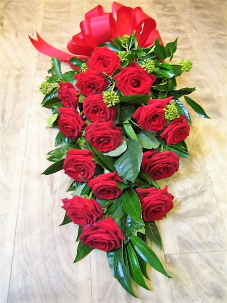 Elegant Red Roses, simply ted, with dark foliage and red ribbon