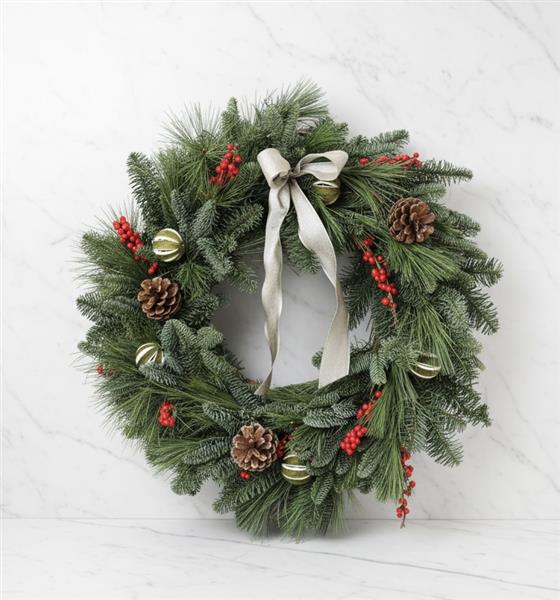 A sumptuous wreath, using traditional Christmas foliage including pine, eucalyptus and holly, with rosehips and dried seedheads, tied with a red velvet bow. Hand made in a moss base, the wreath is 60cm across.