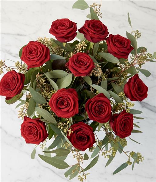 A dozen rich, velvety, Red Naomi roses with berried eucalyptus, hand-tied and delivered in water and a Martyn Crossley gift bag.