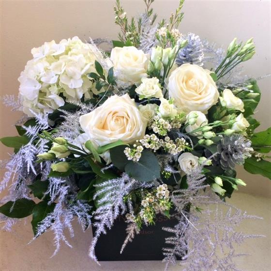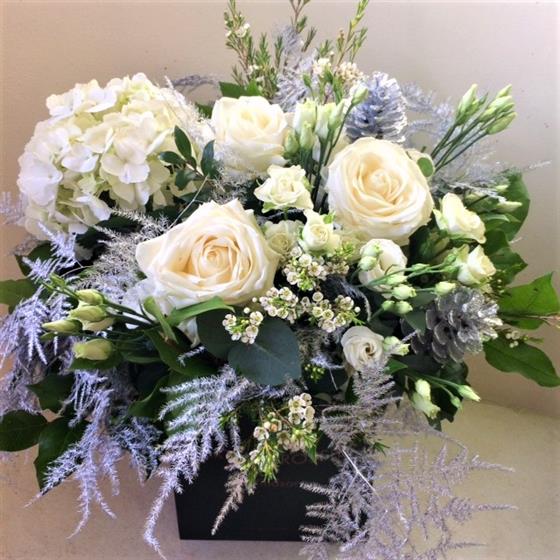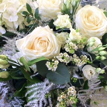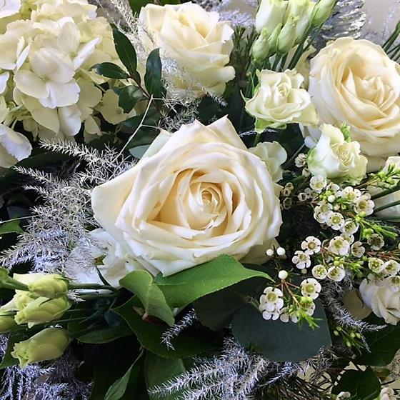 A hand tied bouquet of luxurious white blooms, with a touch of silver fern.